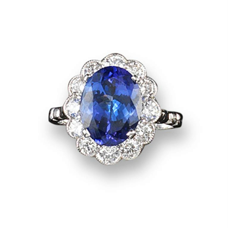 A tanzanite and diamond set cluster ring, the oval shaped tanzanite is set within a surround of round brilliant cut diamonds in white gold. Size M.