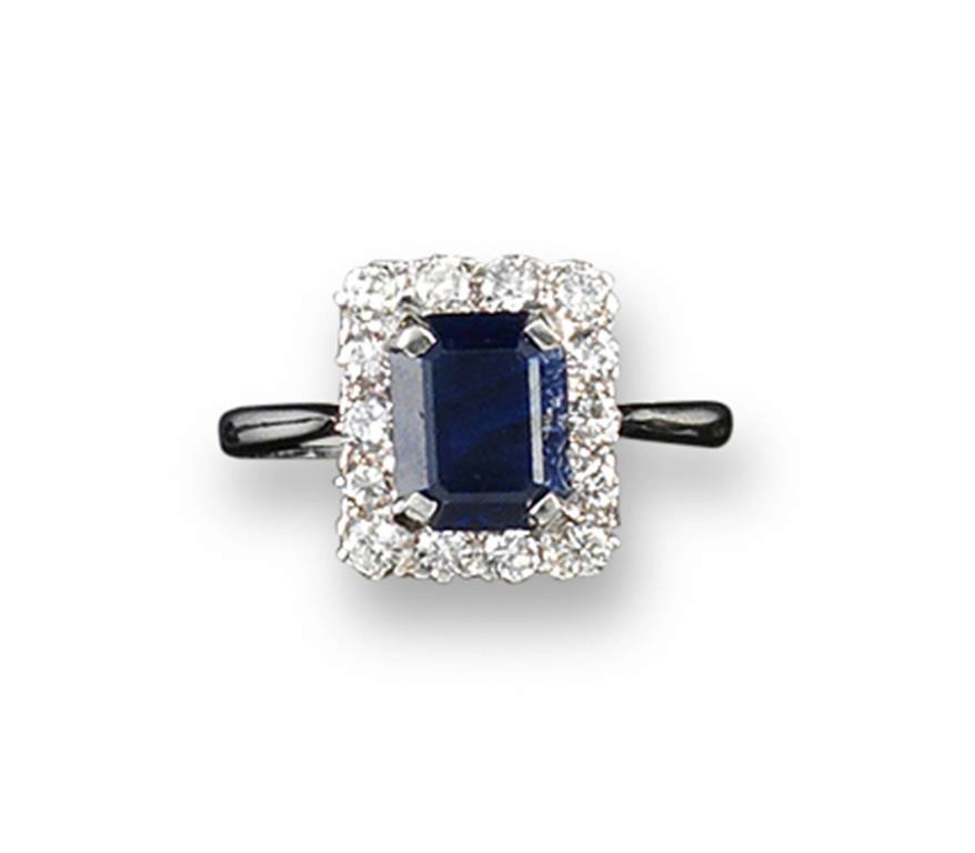 A sapphire and diamond cluster ring, the baguette shaped sapphire is set within a surround of fourteen small circular cut diamonds in platinum and white gold. Size M. Case.
