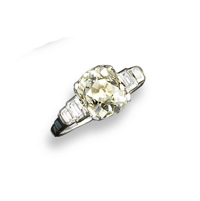 A cushion shaped diamond solitaire ring, the diamond weighs approximately 3.10cts and is set in platinum with four baguette shaped shoulder diamonds.