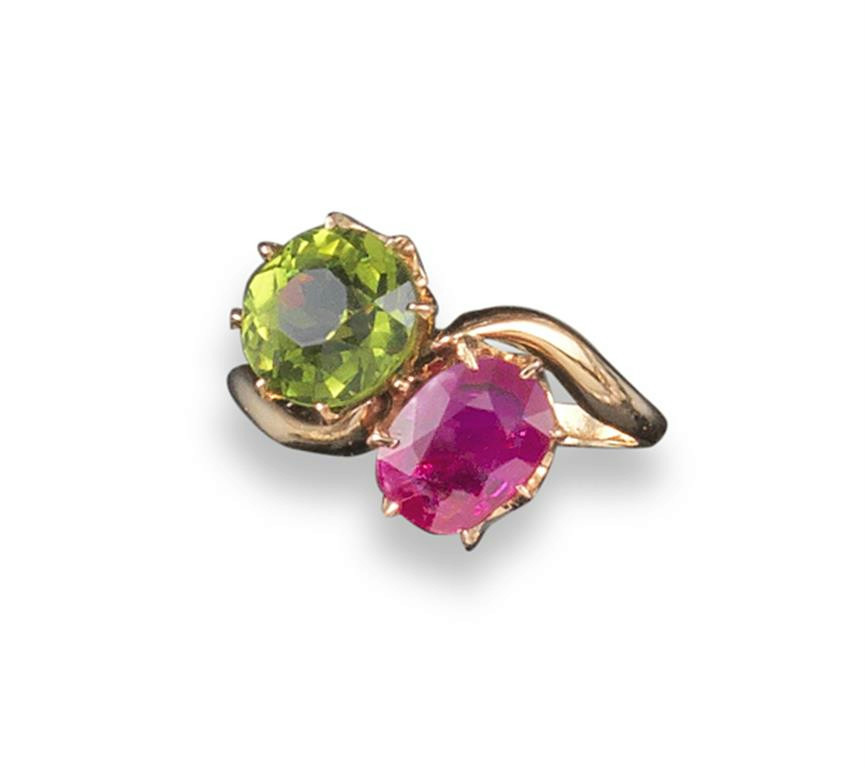 A ruby and peridot set gold cross-over ring