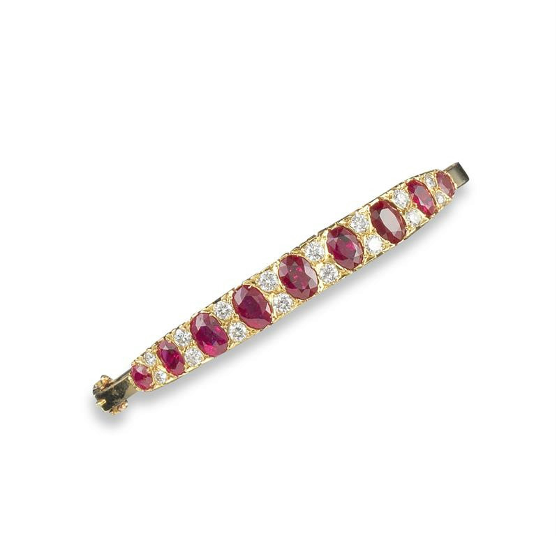 A ruby and diamond set 18ct gold hinged bangle, alternately mounted with graduated oval shaped rubies and pairs of graduated circular cut diamonds. Carved and pierced shoulders. London marks for 1970.