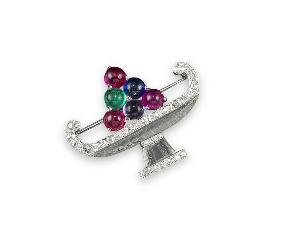 A 'bowl of fruit' brooch by Cartier, C1925. Mounted with cabochon rubies, sapphire emerald and amethyst to the diamond set carved crystal bowl. Repaired foot and the crystal sections probably replaced. Signed Cartier to the pin and the base stamped with slightly obscure number, possibly 523712. 3.8cm wide.