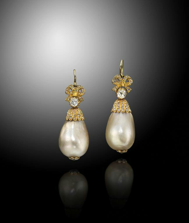 A pair of antique natural pearl drop earrings, suspending from diamond set bows, caps and terminals in gold. Possibly Russian. Cased by Harvey and Gore.
