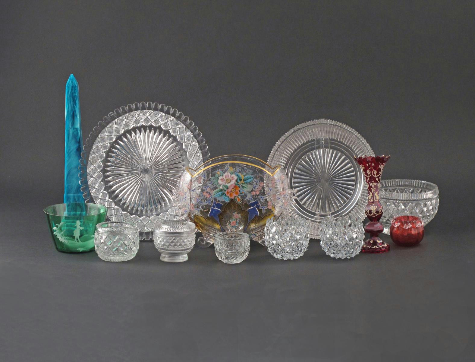 Various cut and coloured glass items 19th and 20th centuries, including two cut glass dishes, six small cut glass bowls, a mottled blue opaque glass obelisk, a painted glass vase, two coloured glass bowls, one with Mary Gregory type decoration, and a ruby-flashed vase with white enamelling, 25cm max. (13)