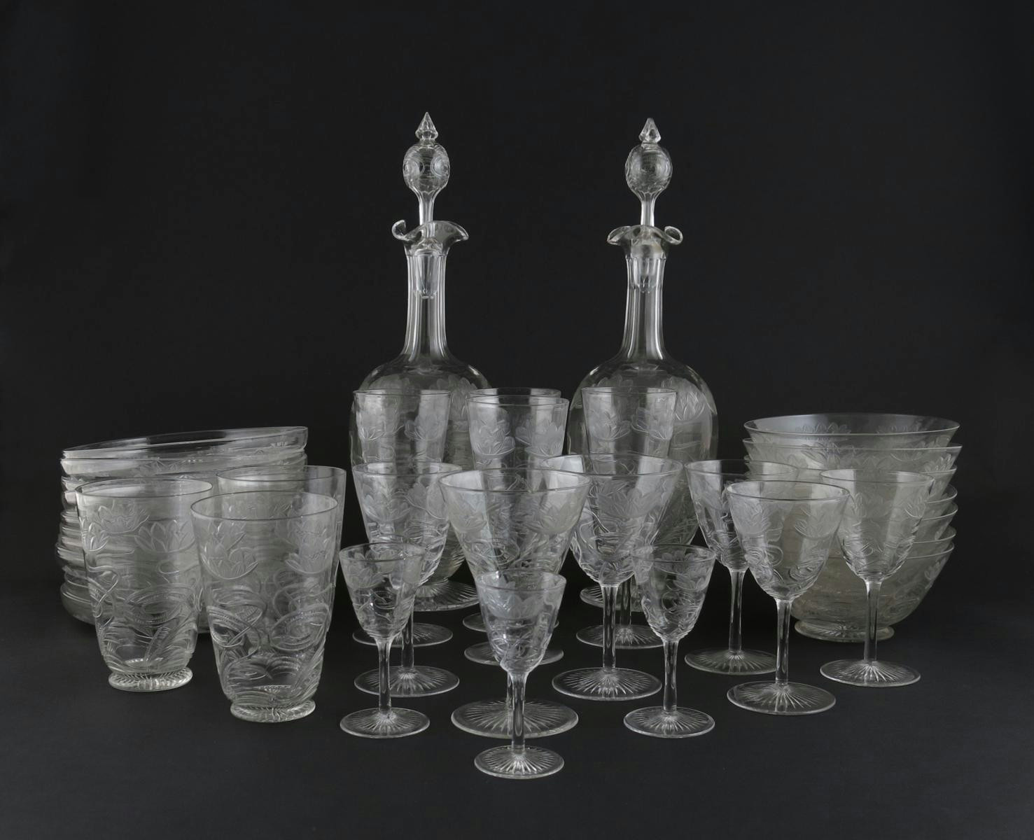 An extensive suite of glass early 20th century, richly engraved with a swirling floral design and raised on delicate stems above starcut feet. Comprising: two decanters and stoppers, 13 bowls with 19 stands, 14 champagne flutes, 11 beakers, 18 red wine glasses, 16 white wine glasses, 14 sherry or port glasses, and nine liqueur glasses. (118)