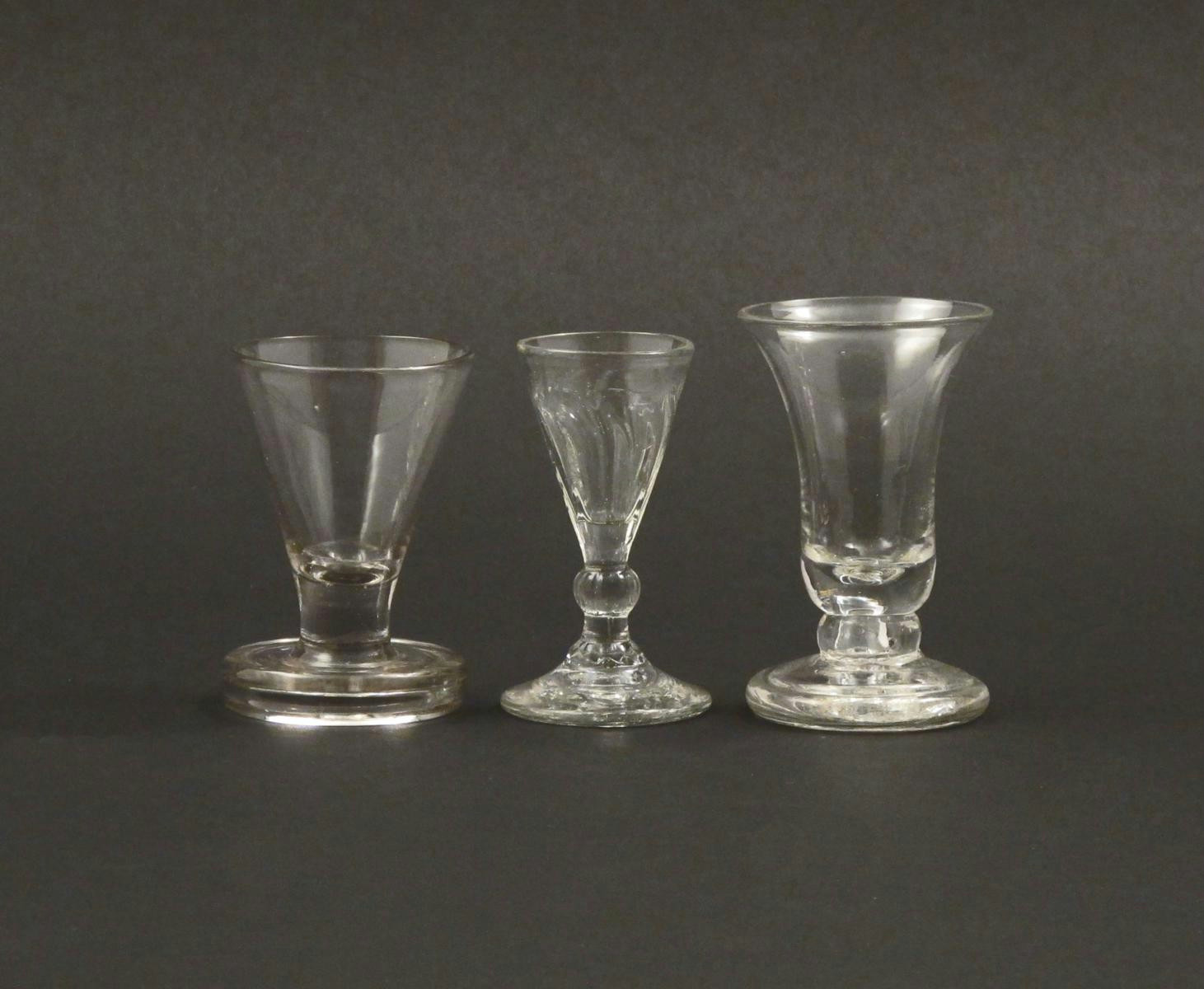 Two firing glasses 2nd half 18th century, one bell-shaped, the other with a flared bowl, both raised on a thick firing foot, and a small glass with wrythen moulded bowl, 10cm max. (3)