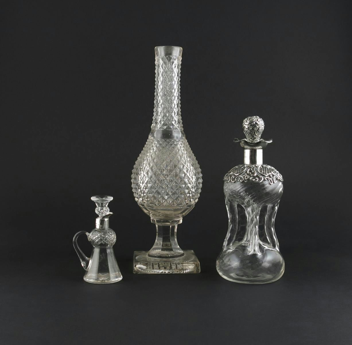 A cruciform silver-mounted carafe and stopper 19th century, with silver pierced panels and C scrolls extending over the shoulder, Birmingham hallmark, a tall cut glass vase raised on a heavy square base, and a silver-mounted oil jug and stopper, 34.2cm max. (5)