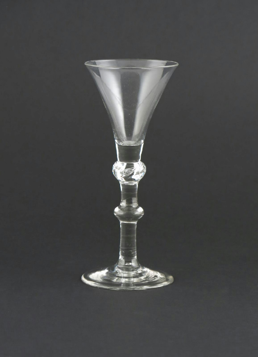 A wine glass with composite stem c.1760, the flared trumpet bowl raised on a stem with a knop of airtwists above a second plain knop, 16.2cm.