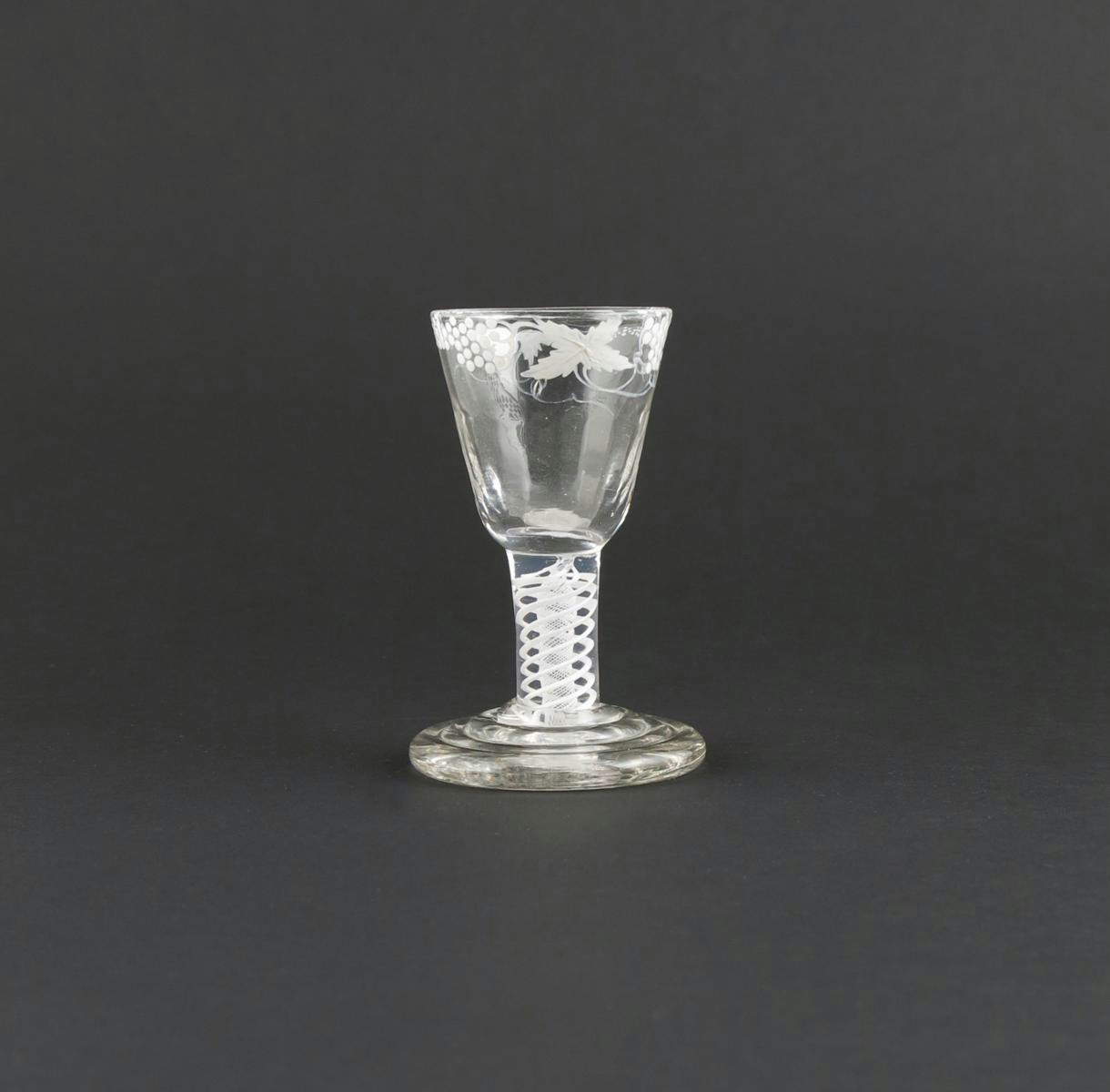 A rare Beilby firing glass c.1765, the bucket-shaped bowl enamelled in white with a continuous band of grapevine around the rim, raised on a squat double series opaque twist stem above a thick stepped foot, 9.2cm.