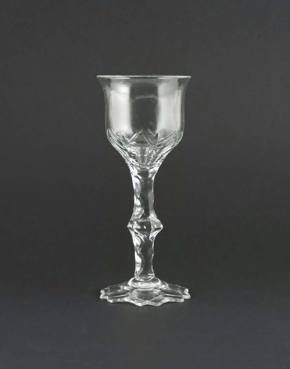 A good cut goblet c.1740, the generous ogee bowl with petal cutting to the base, rising from a knopped faceted stem above a shaped foot, 19.2cm.