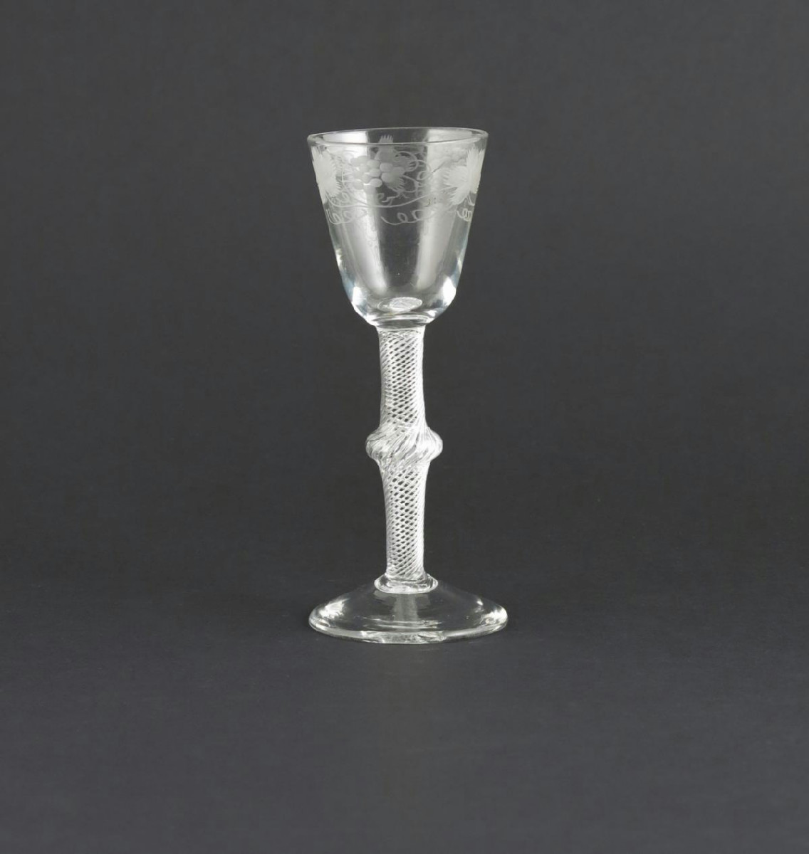 A wine glass c.1760, the funnel bowl engraved with a continuous band of grapevine, raised on an airtwist stem with a single central knop, 15cm.