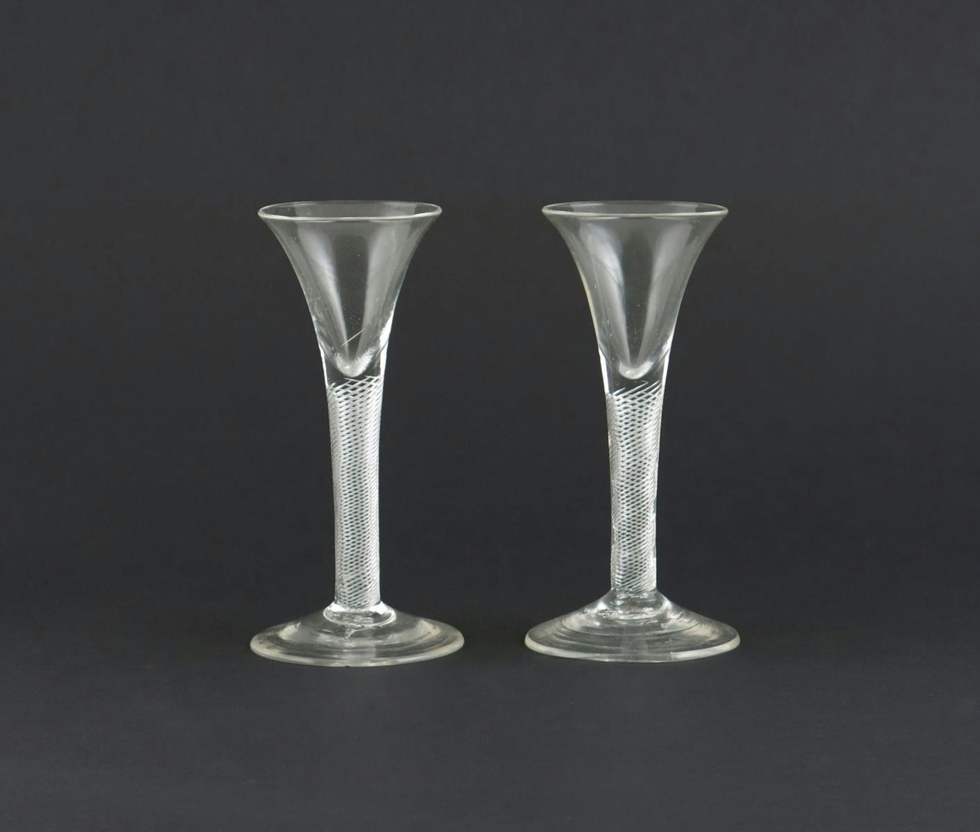 A pair of wine glassses mid 18th century, with drawn trumpet bowls raising from thick airtwist stems, 15.5cm. (2)