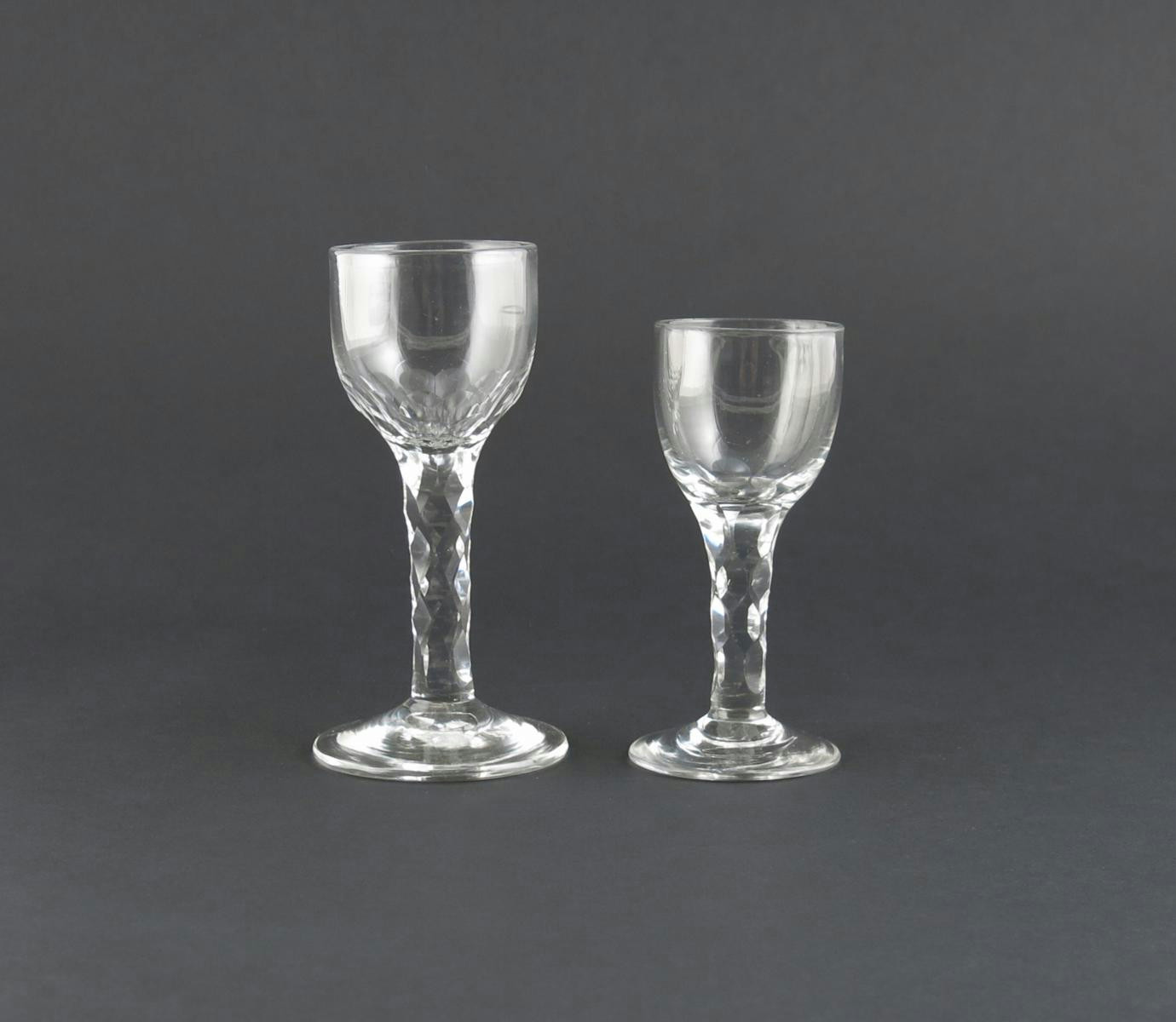 Two wine glasses 2nd half 18th century, the rounded bowls each raised on a facet cut stem, 13.8cm max. (2)