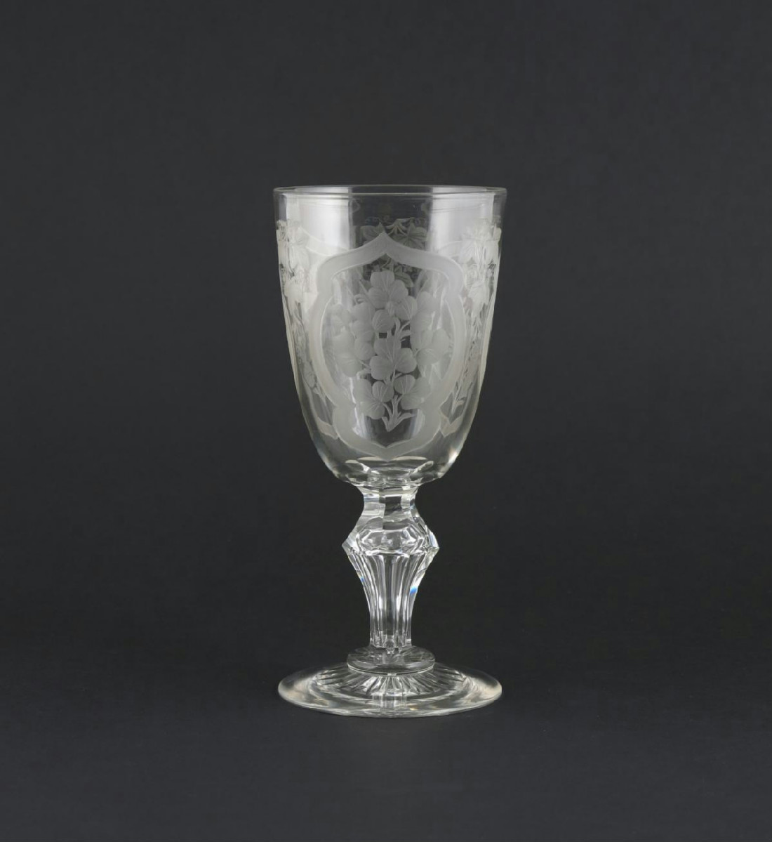 A large Union glass, engraved with panels of rose, thistle and shamrock with grapevine motifs between, raised on a baluster stem, 19.3cm.
