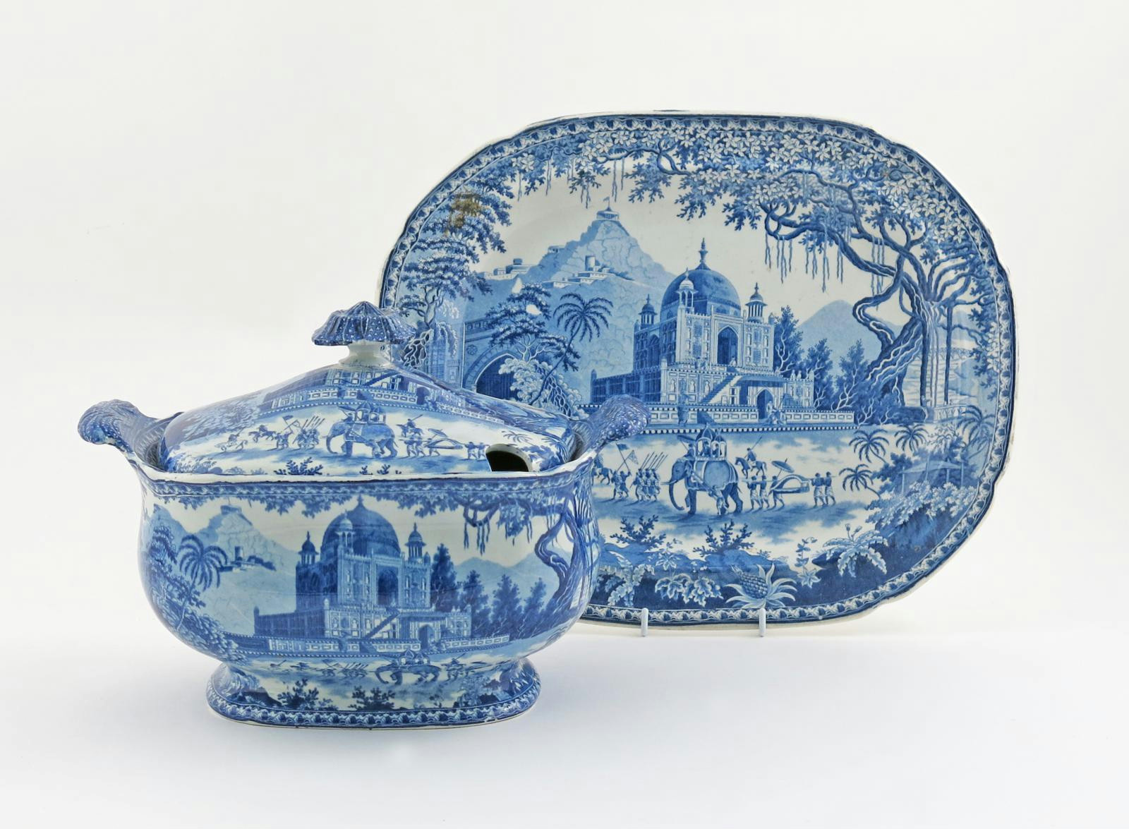A Herculaneum blue and white transferware tureen with cover and stand 19th century, from the Indian series, printed with a view of the Mausoleum of Sultan Purveiz, near Allahabad, 38cm. (3)
