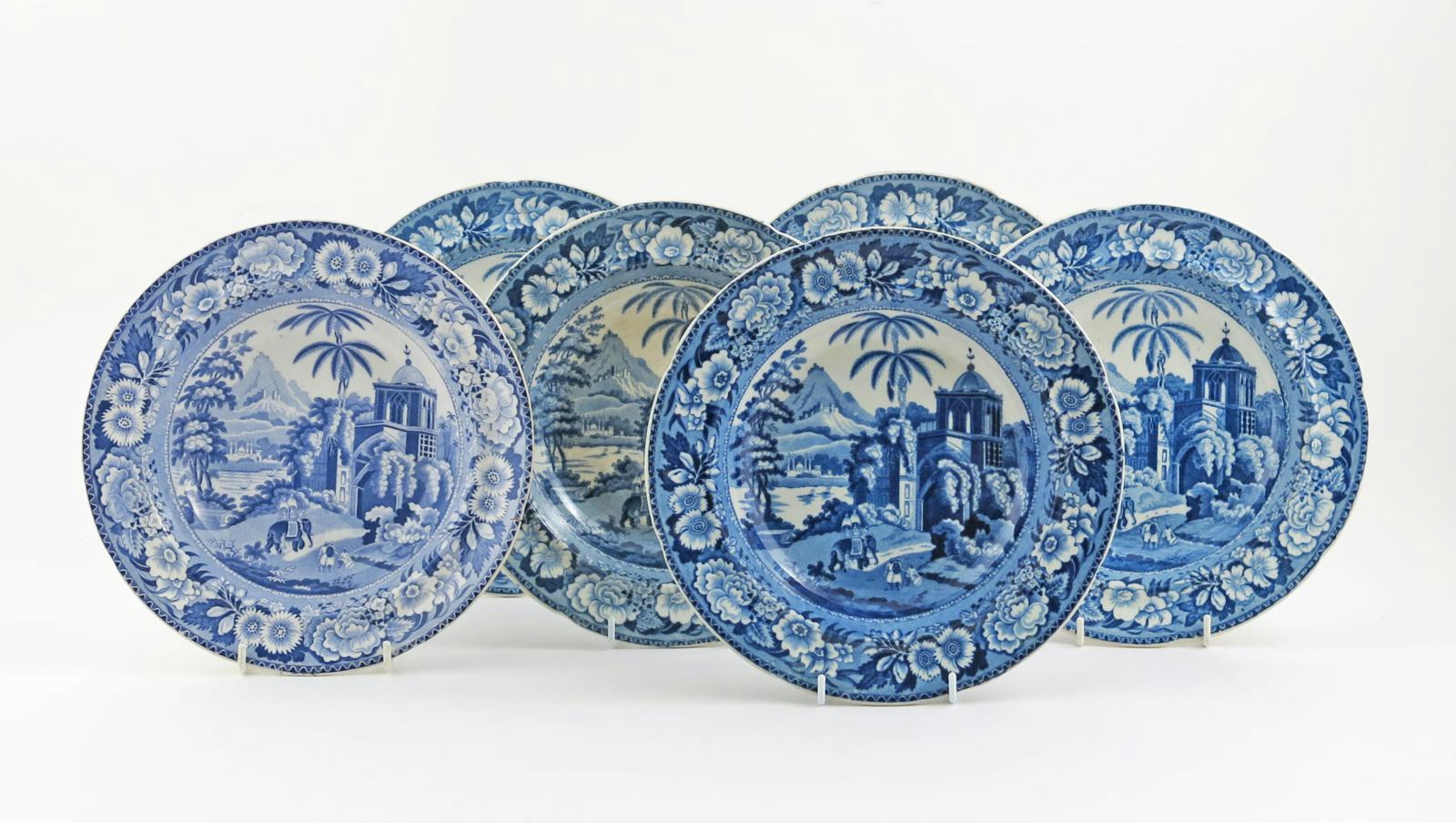 Six Herculaneum blue and white transferware soup plates 19th century, from the Indian series, printed with a view in the Fort Madura within wide floral borders, impressed marks, 25cm. (6)