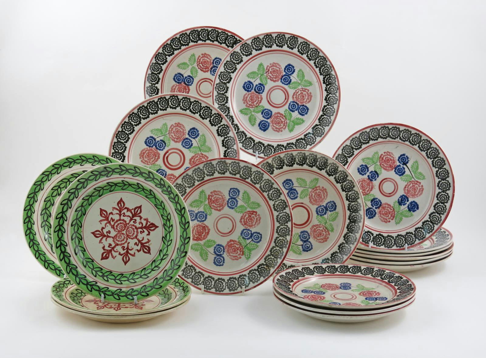 Fourteen Gaudy Welsh pottery plates 19th century, decorated with a floral design in shades of red, blue and green within a black flowerhead border, and four other Gaudy Welsh plates with a red floral design within green leaf borders, 25cm max. (18)