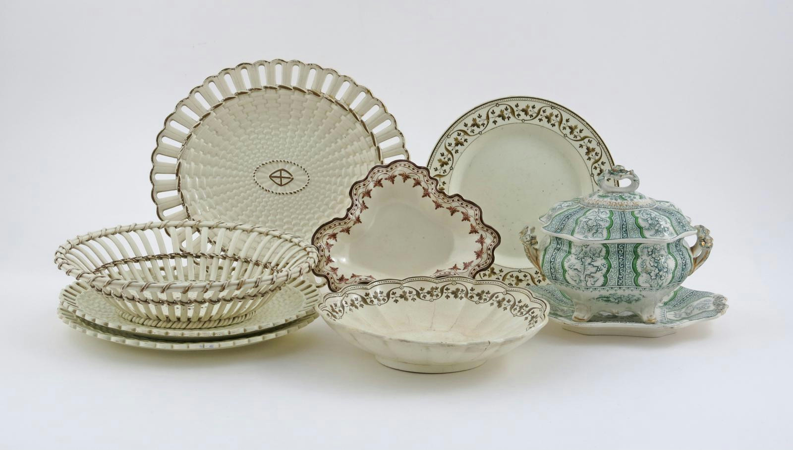 A small collection of creamware and pearlware late 18th/19th century, including a Wedgwood basket and stand, two other creamware basket stands, a stone china sauce tureen with cover and stand, and three shaped creamware dishes with a brown leaf design, 26cm max. (10)
