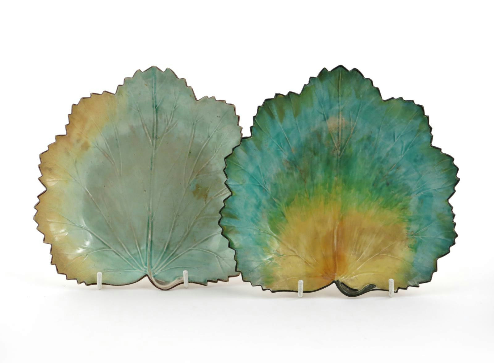 A pair of Davenport creamware leaf dishes early 19th century, each formed as a large vine leaf and coloured in shades of green and yellow, impressed anchor marks, 20cm. (2)