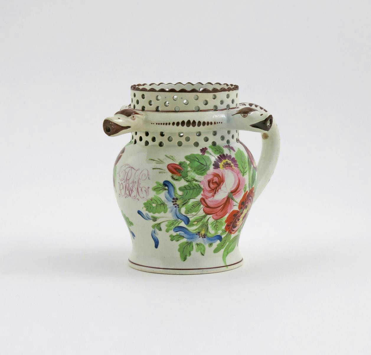 A small pearlware puzzle jug 19th century, boldly painted with flowers around the monogram 'RFC', the neck with three serpent head spouts between bands of piercing, 12.5cm.