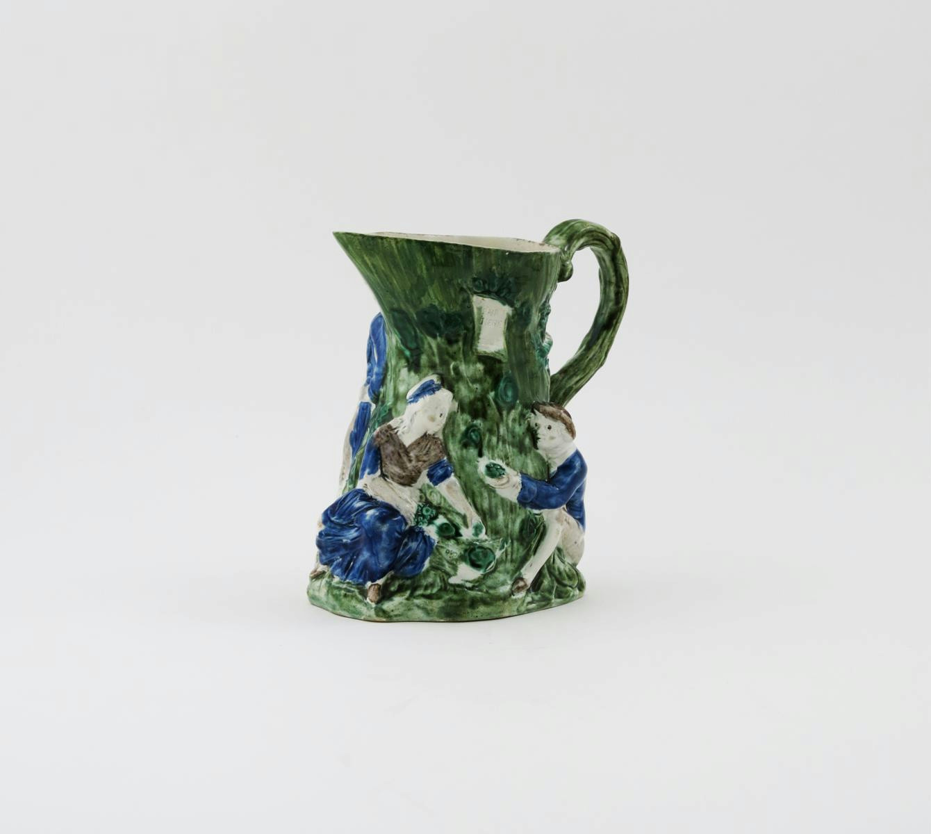 A Robert Garner pearlware 'Fair Hebe' jug c.1788, after the design by John Voyez, one side moulded with three figures and a dog encircling the jug, one side titled 'Fair Hebe' the reverse 'A Bumper, a bumper', the initials 'RG' impressed into the bottle on one side, the reverse inscribed 'D Voin '78', enamelled in shades of blue, grey and green, 20cm.