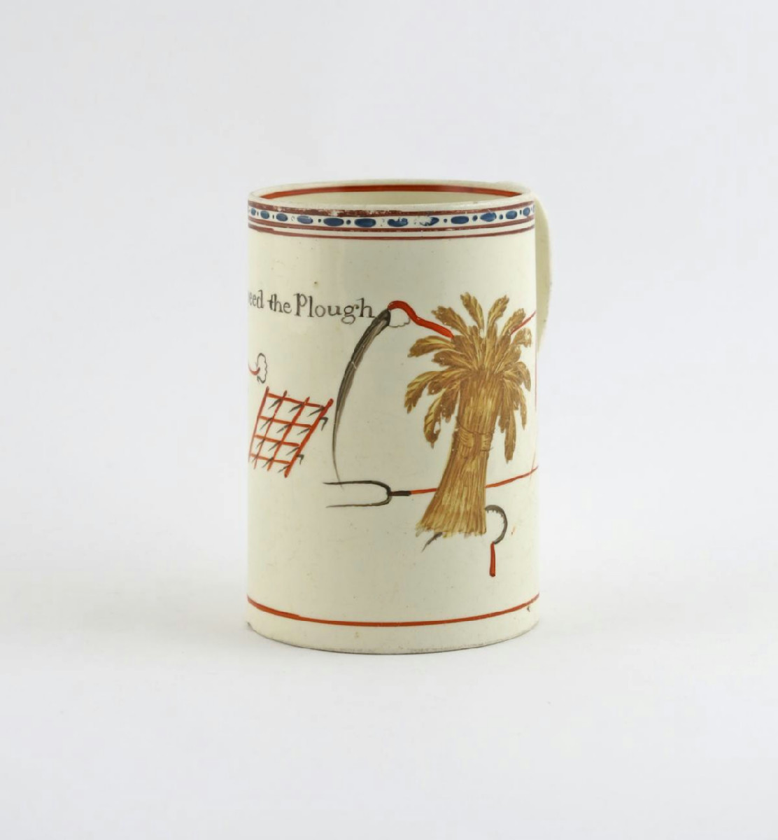 A creamware farming mug early 19th century, painted with various farming implements including a sickle, rake, pitchfork and corn stook, titled 'God speed the Plough', 12cm.
