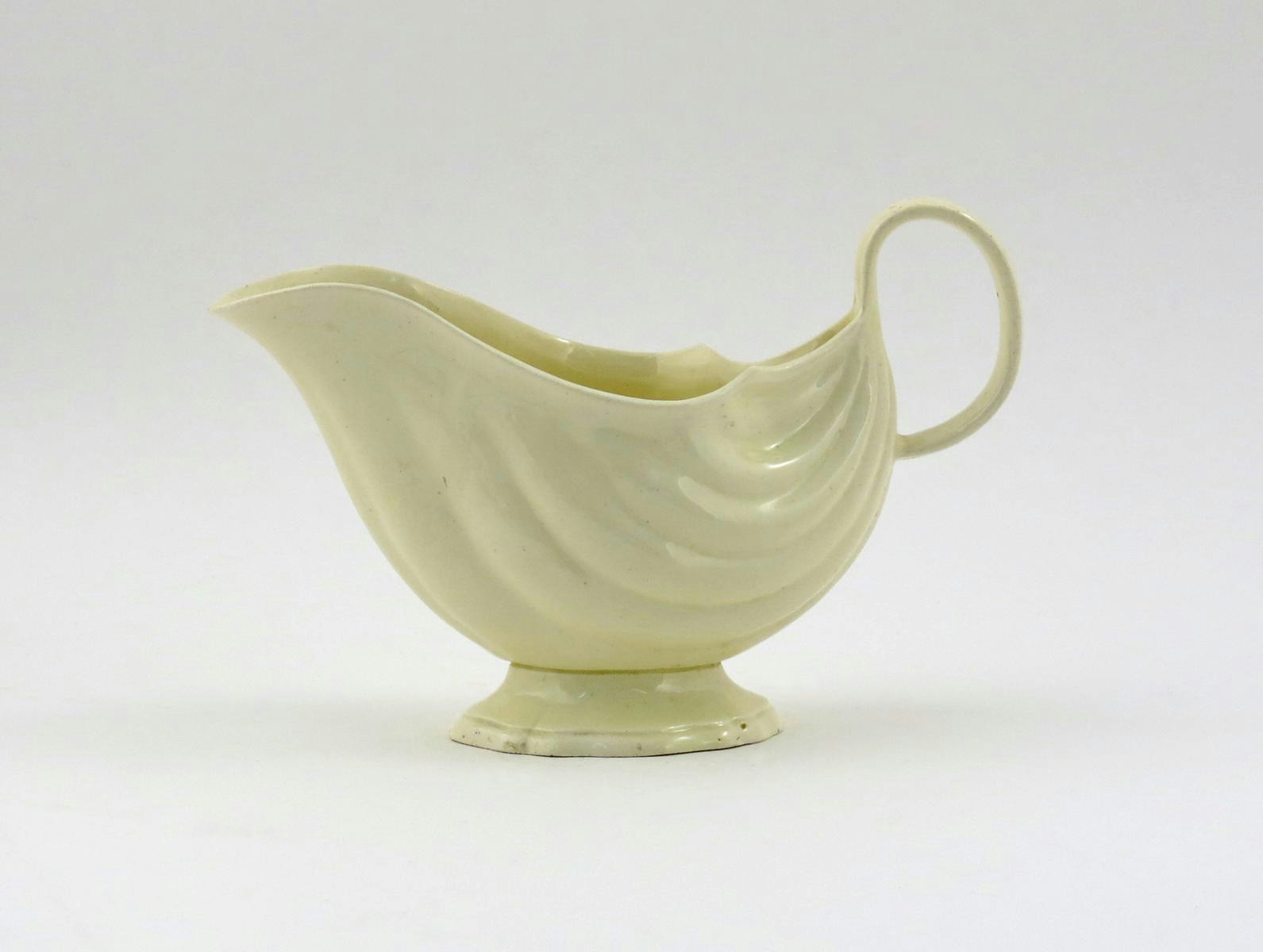A good creamware sauceboat late 18th century, perhaps Leeds Pottery, of moulded shell shape with a strap handle, 21cm.