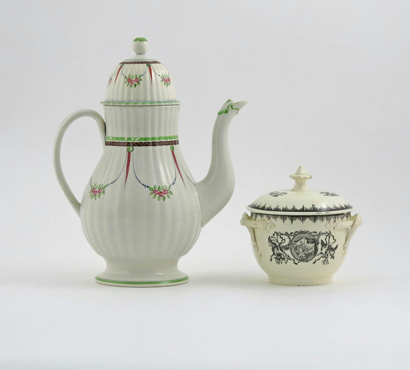 A Neale creamware sucrier and cover c.1785, printed in black with a panel of Minerva surrounded by emblems of Wisdom and Industry, titled 'Let Wisdom Unite Us', the reverse with birds, and a fluted pearlware coffee pot and cover painted with rose garlands, 27cm max. (4)