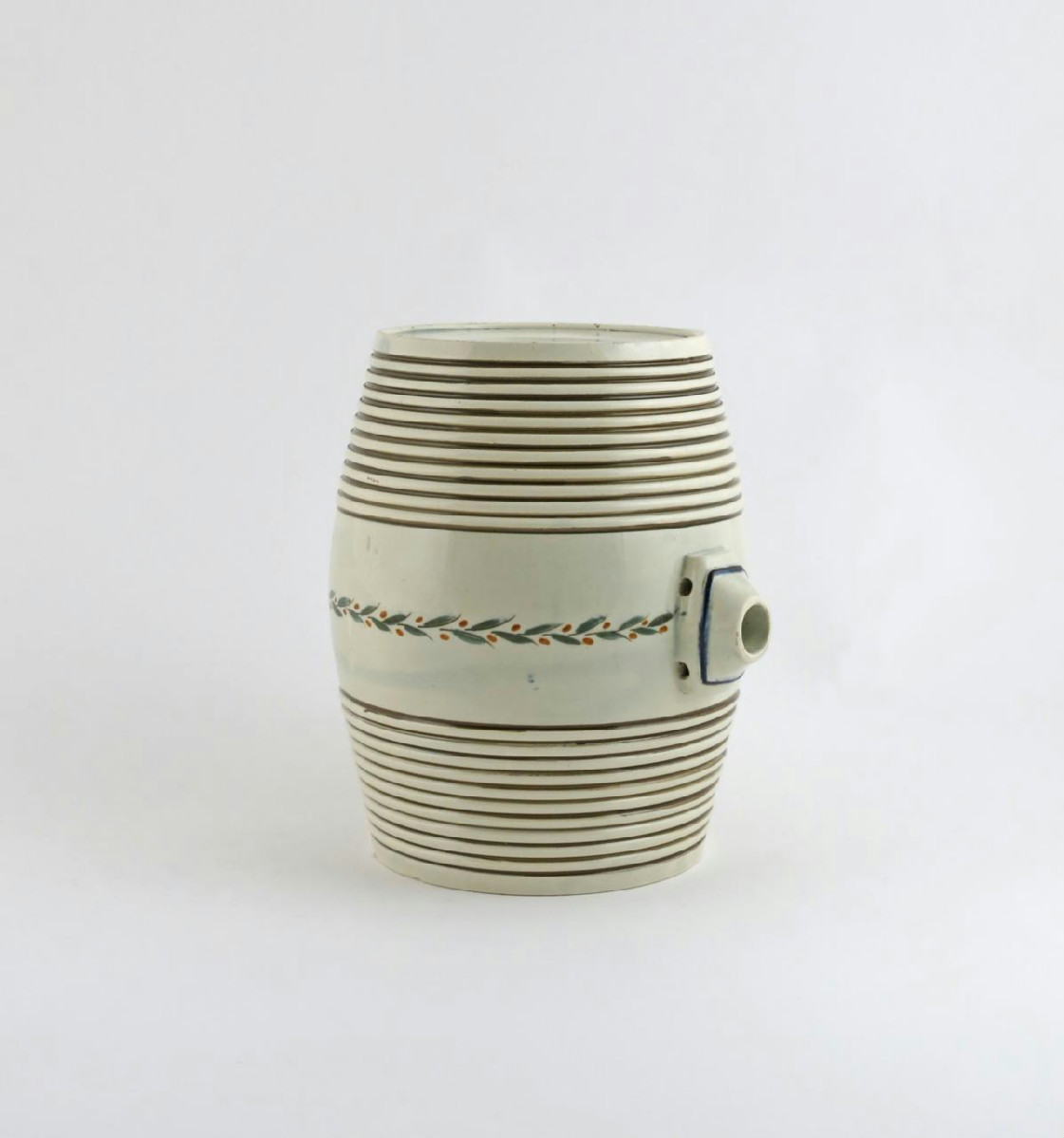 A Pratt ware spirit barrel c.1800, with a central opening, a simple husk garland encircling the body between ribbed umber bands, 21.2cm.