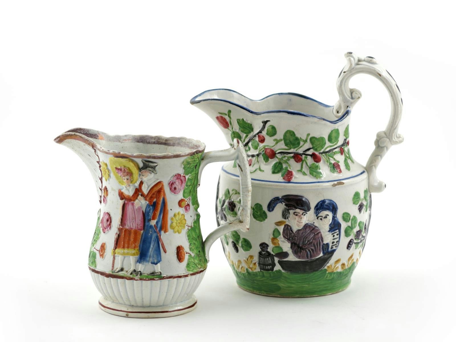 Two pearlware moulded jugs 1st half 19th century, one moulded and coloured with a promenading couple, the other with drinkers between garlands of hops and grapevine, 21cm max. (2)