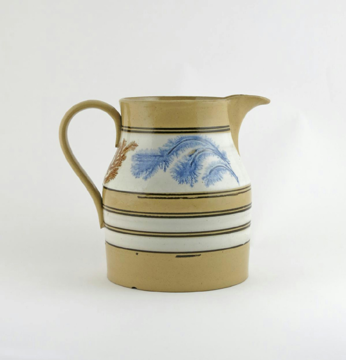 A large Mochaware jug 19th century, decorated with a band of seaweed tendrils in blue and brown, between white, brown and buff bands, 23cm high.