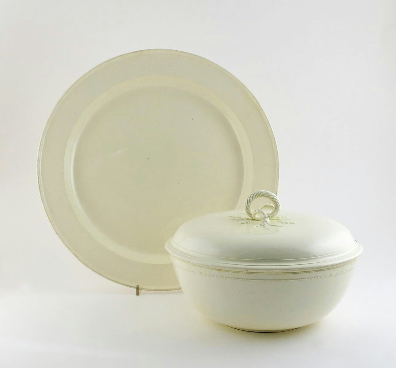 A massive Leeds Pottery creamware circular charger 19th century, impressed mark, and a large creamware circular tureen and cover, the cover with an elaborate finial issuing from applied leaves, 45cm. (3)