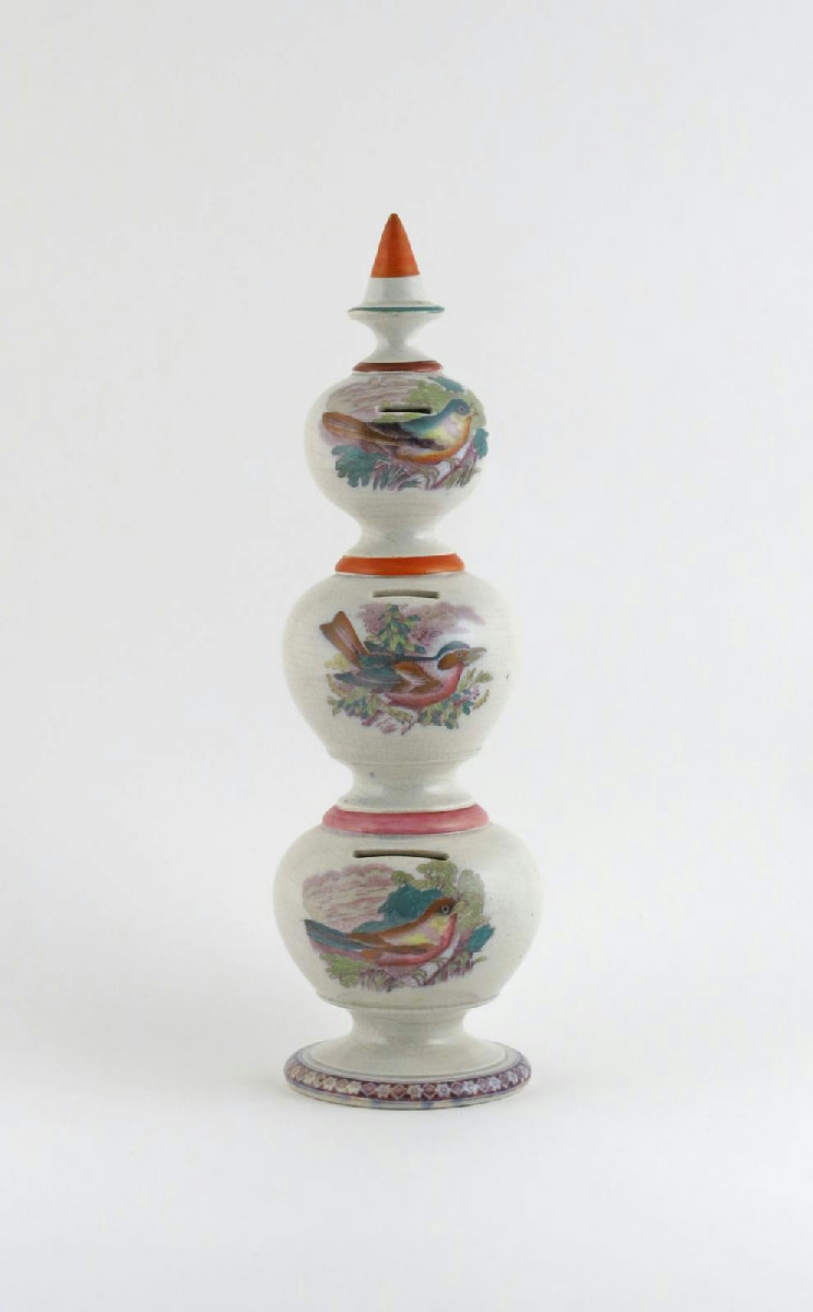 A David Lockhart & Co pearlware three-tiered moneybox c.1870, each circular section decorated with a large bird and pierced with a horizontal slit, printed mark, 35.5cm.