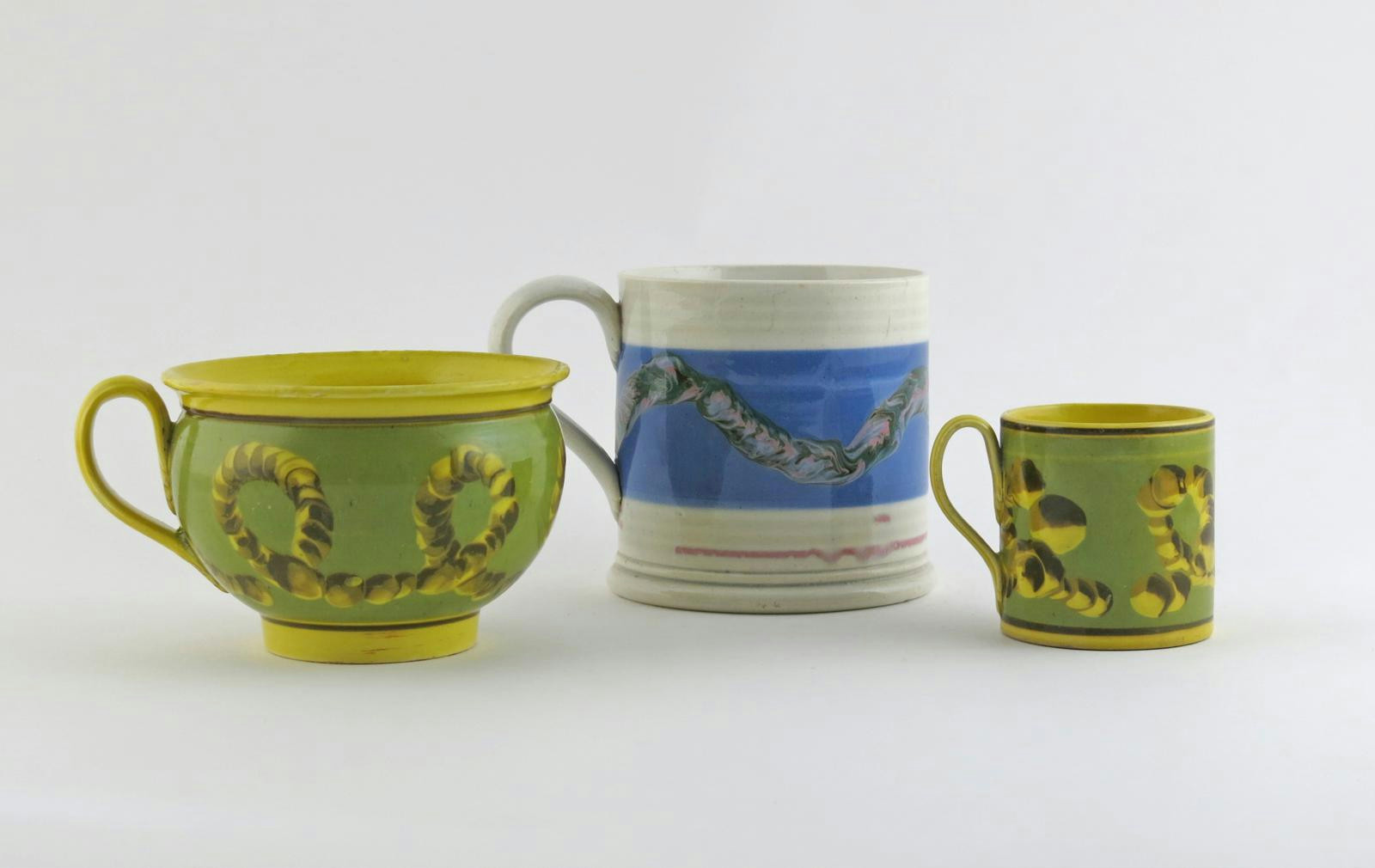 Three Mochaware mugs or cups 1st half 19th century, decorated with worm-like designs of marbled colour on a blue or green ground, two with yellow bodies, 10.5cm max. (3)