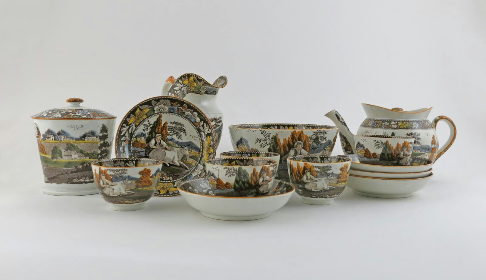 A Shorthose and Heath pearlware part tea service early 19th century, of Pratt type, printed and coloured with a farmer and cow within wide floral borders. Comprising: a teapot and cover, a sugar box and cover, a milk jug, a slop bowl, five teabowls and five saucers. (16)