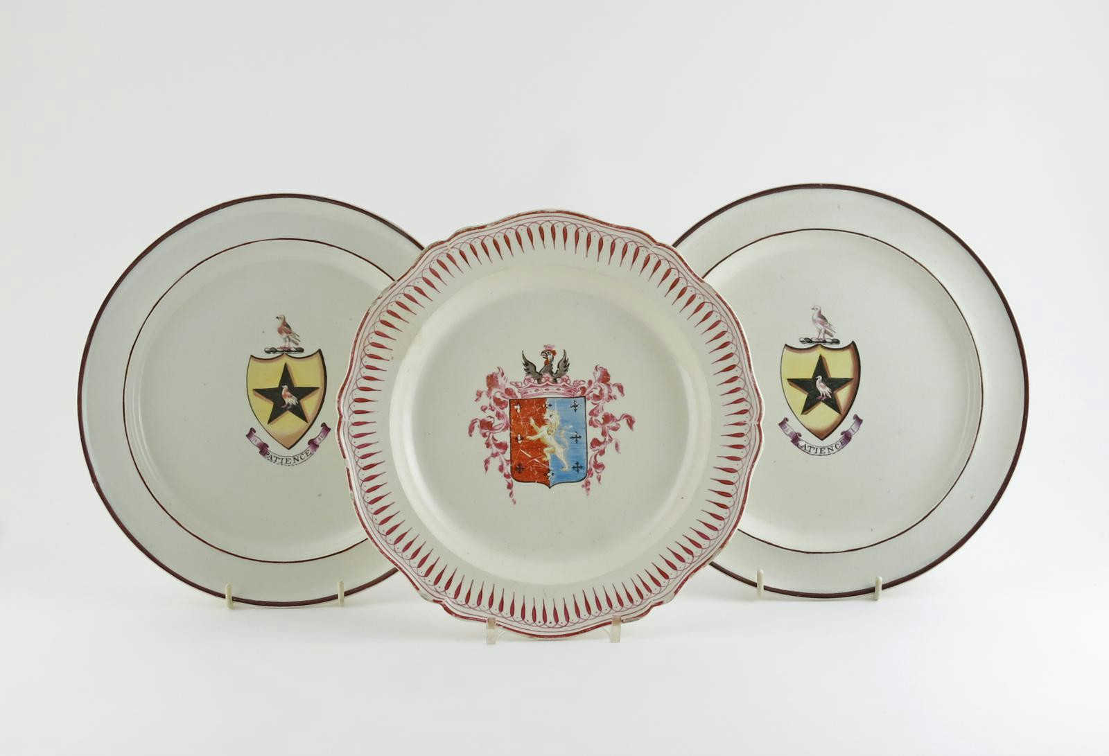 A pair of pearlware armorial plates c.1800, the well decorated with a bird within a black star on a shield with a bird crest above and the motto 'Patience' beneath, and a creamware armorial plate with a central shield of a lion beneath a crowing cockerel crest, 24.5cm. (3)