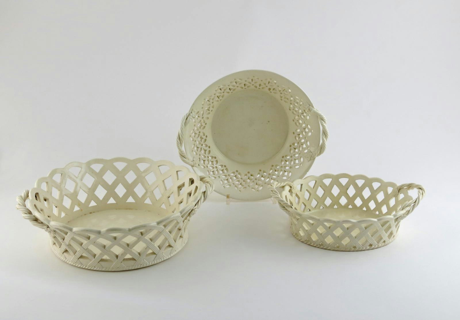 Three creamware baskets late 18th century, two with open strapwork sides and twisted handles, the last with sharply sloping sides elaborately pierced with a stylized floral design, 26.5cm max. (3)