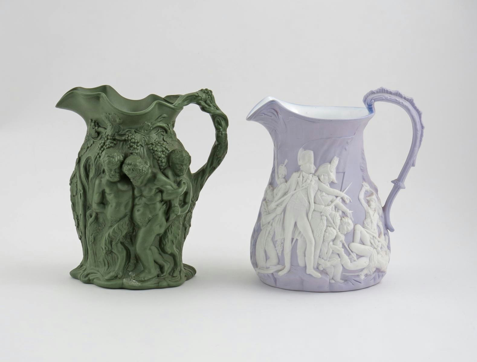 A Samuel Alcock Parian moulded jug of naval interest c.1845, decorated in white relief on a lilac ground with Sir William Sidney Smith (later Admiral) defending the breach at Acre, printed Royal Arms mark, and a green moulded Bacchanalian jug with carousing putti, 23cm max. (2)