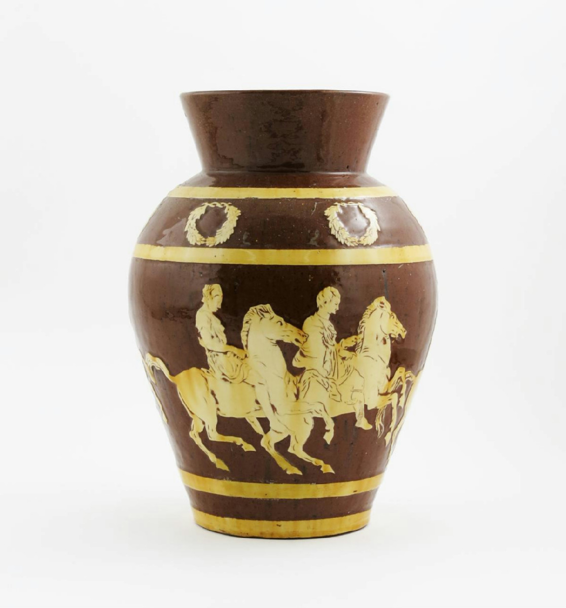 A large Sussex Pottery encaustic ware vase 19th century, decorated with a continuous band of figures on horseback between concentric cream bands and laurel wreath motifs, 35cm.