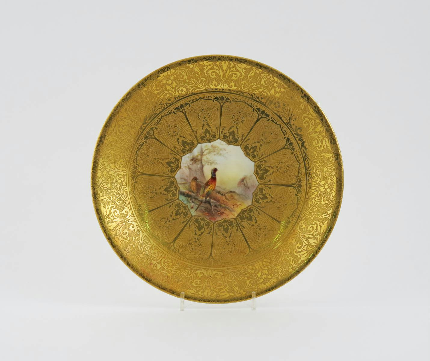 A Royal Worcester cabinet plate date code for 1939, the well with a lotus-shaped panel; painted by James Stinton with a pair of pheasants in woodland, within a wide elaborate textured gilt rim of lotus panels and foliate motifs, gilt mark, titled 'Specially made for Asprey's', 23.5cm.