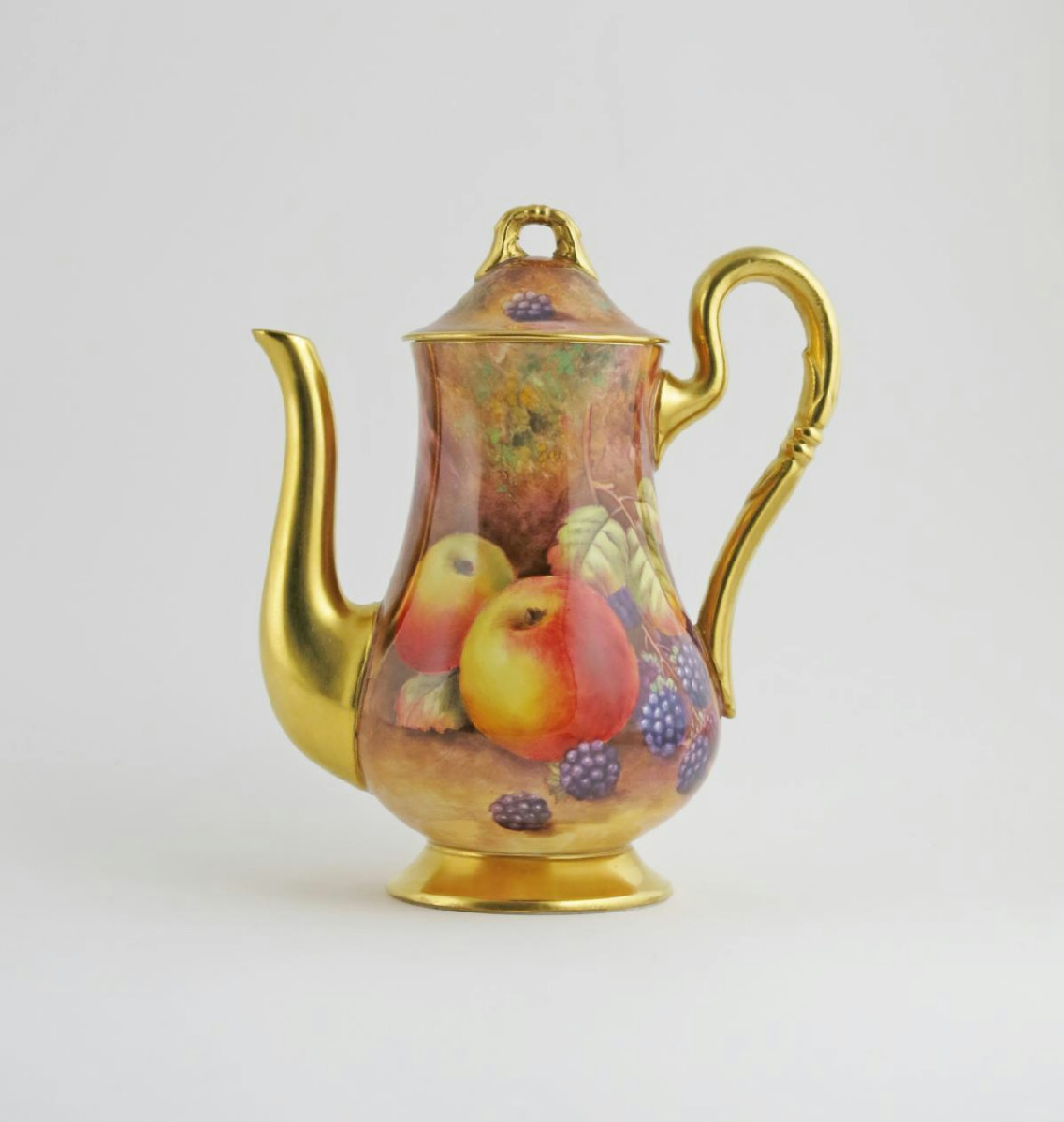A Royal Worcester coffee pot and cover date codes for 1941, painted by Horace Price with apples and blackberry sprays, the reverse with an apple and cherries, the spout, handle and finial richly gilded, printed marks, 18cm high. (2)