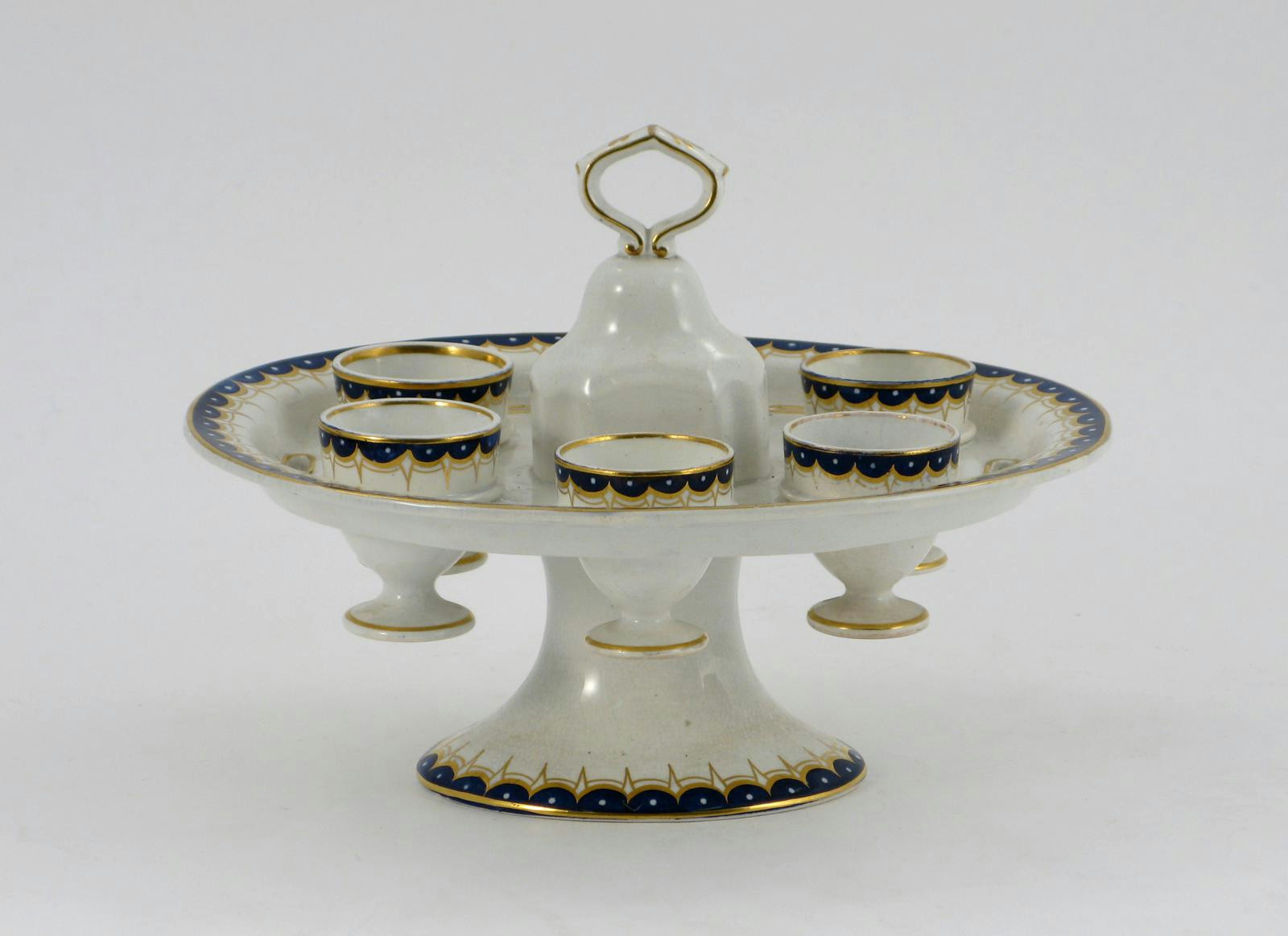 A Davenport pearlware egg cruet 19th century, with six cups and alternate slots to fit six spoons, all decorated with a border of blue and gilt dentils, 23cm. (7)