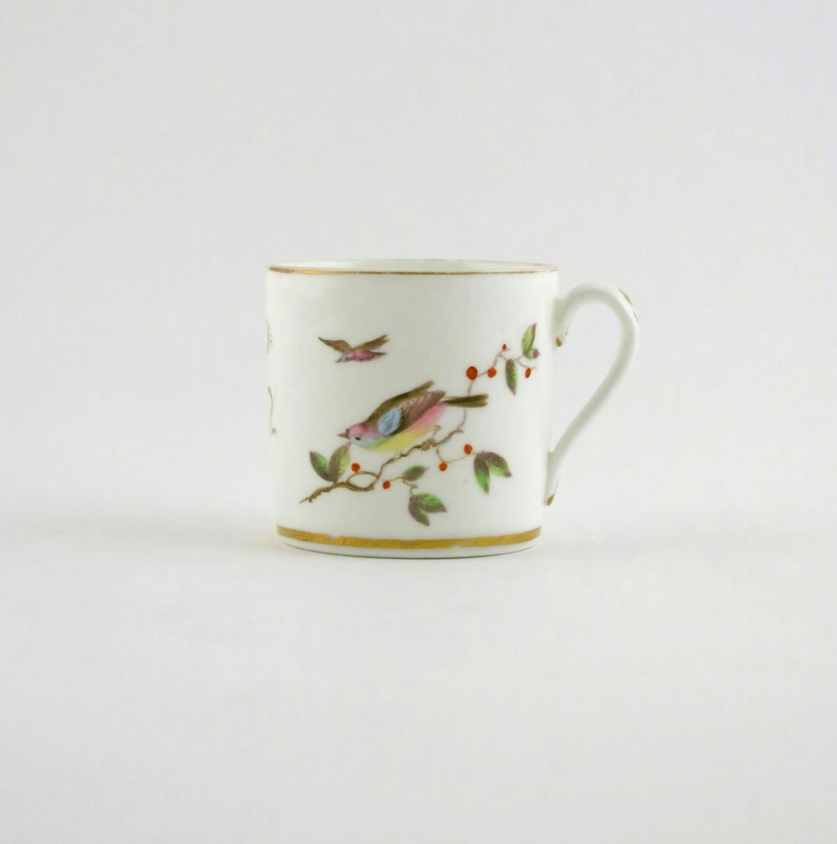 A rare Nantgarw coffee can c.1818-20, painted by Thomas Pardoe with a songbird perched on a berried branch, with a further bird in flight above, the reverse with a tulip, gilt initial L, 6cm high.