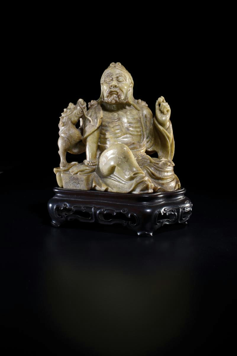 A large Chinese soapstone model of the dragon luohan 19th century, sitting holding a pearl in his left hand, and with a dragon emerging from a bowl to his right, his robes engraved with cloud scrolls, the base carved with a poem, including an inscription for the Qianlong reign, raised on an elaborate hardwood stand, 16cm. (2)