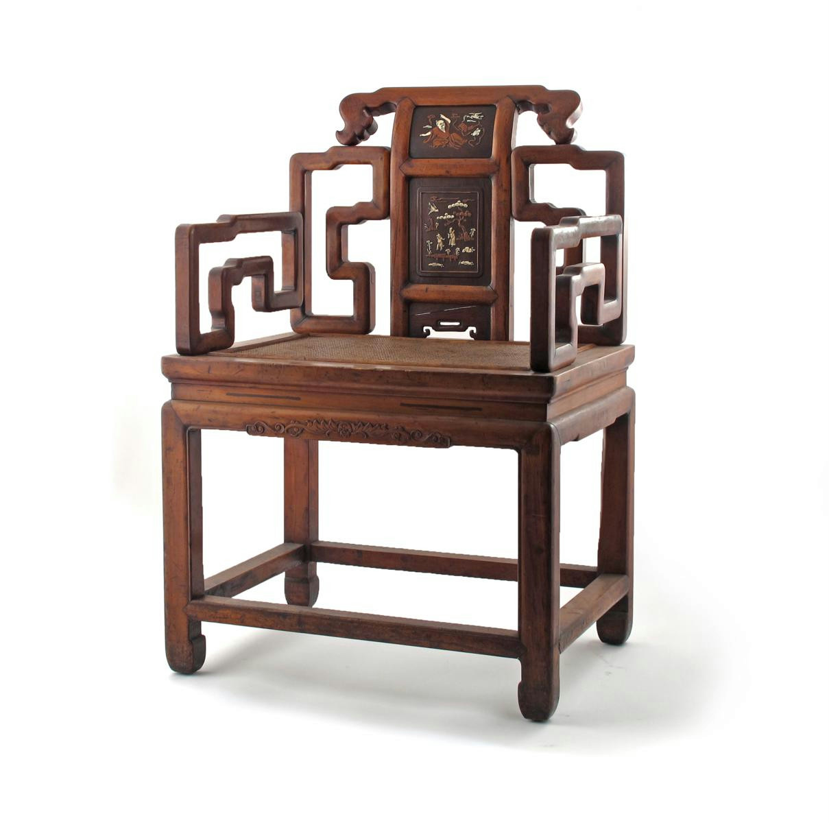 A Chinese hardwood armchair 19th century, the curving central splat with two panels inset with carved ivory figures, birds and a pine tree, the apron with stylized bat motifs, the rectangular seat with an inset rattan panel, 93.5cm x 46.5cm x 64cm.