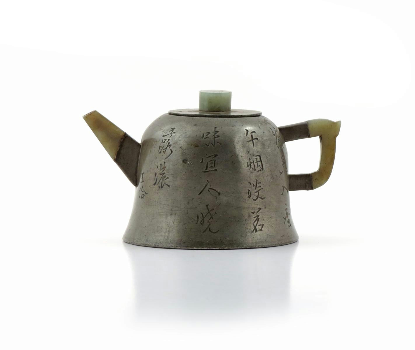 A Chinese Yixing pewter-encased san xiang hu teapot and cover 19th century, the domed body with bamboo and a poem by Wang Qia, the handle, spout and finial jade, the interior with a seal mark, 16cm. (2)