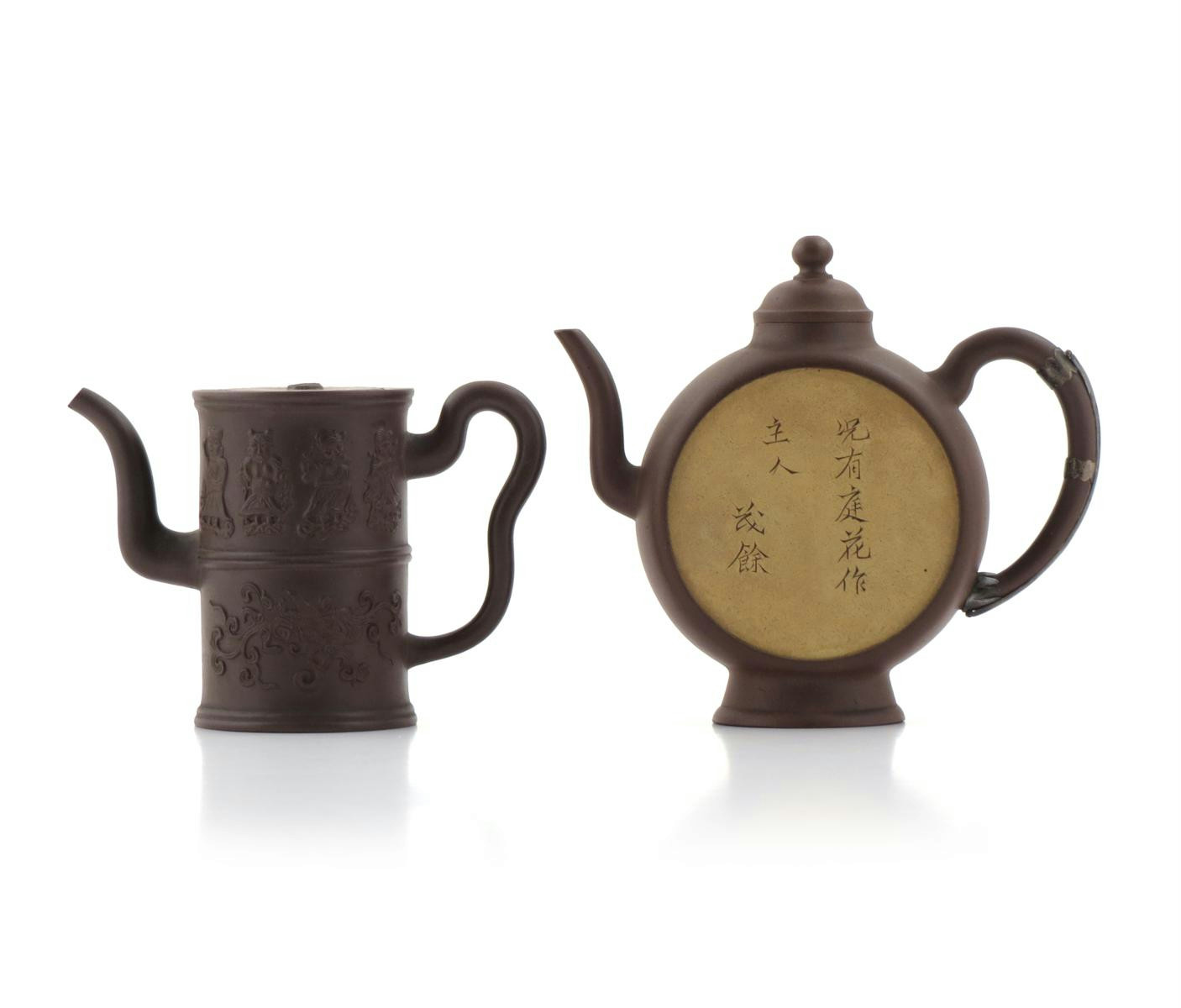 Two Chinese Yixing teapots and covers 18th/19th century, one cylindrical and decorated with moulded figures and dragons, the other of flattened circular form, inscribed to one side with a poem, with a domed cover, the handle metal-mounted, both unmarked, 19.3cm. (4)