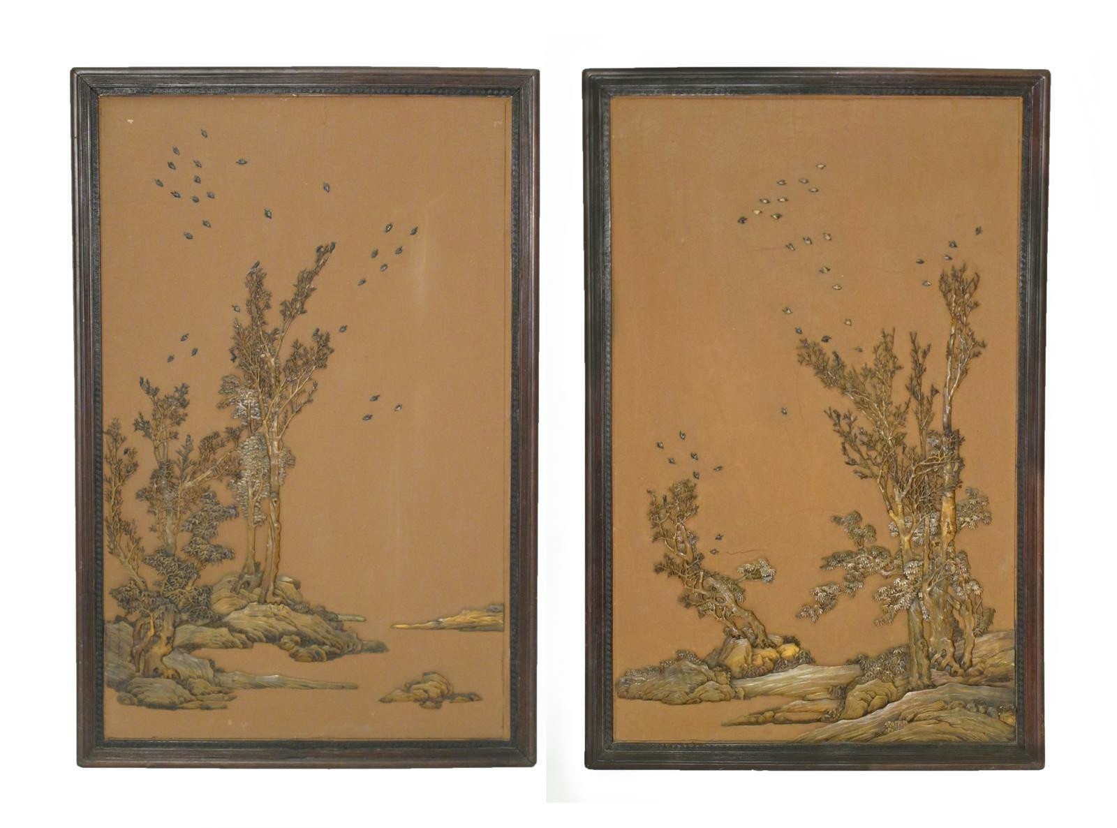 A rare pair of Chinese Imperial wall panels 19th century, each decorated in buffalo horn, carved in shallow relief with tall trees and leafy maple on small rocky islands, with flocks of small birds flying to roost in the treetops, all on a brown lacquer ground and mounted within zitan and hardwood frames, 99.5cm x 66cm overall. (2)