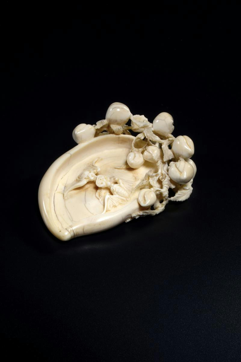λ A good Chinese ivory brush washer 19th century, carved naturalistically as a large peach, with many other smaller fruits issuing from a leafy stalk, with two bats perched in the centre with their wings outstretched, a small ruyi-head between them, 9.6cm.