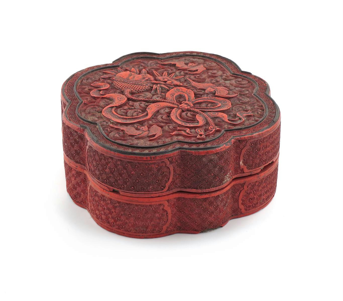 A Chinese red cinnabar lacquer box and cover Qianlong 1736-95, the lid carved in relief with a ribbon-tied sceptre, from which peaches and lingzhi flow, and with three bats in flight on a scrolling ground, the borders and sides with key fret and geometric diaper designs, 15.5cm. (2)